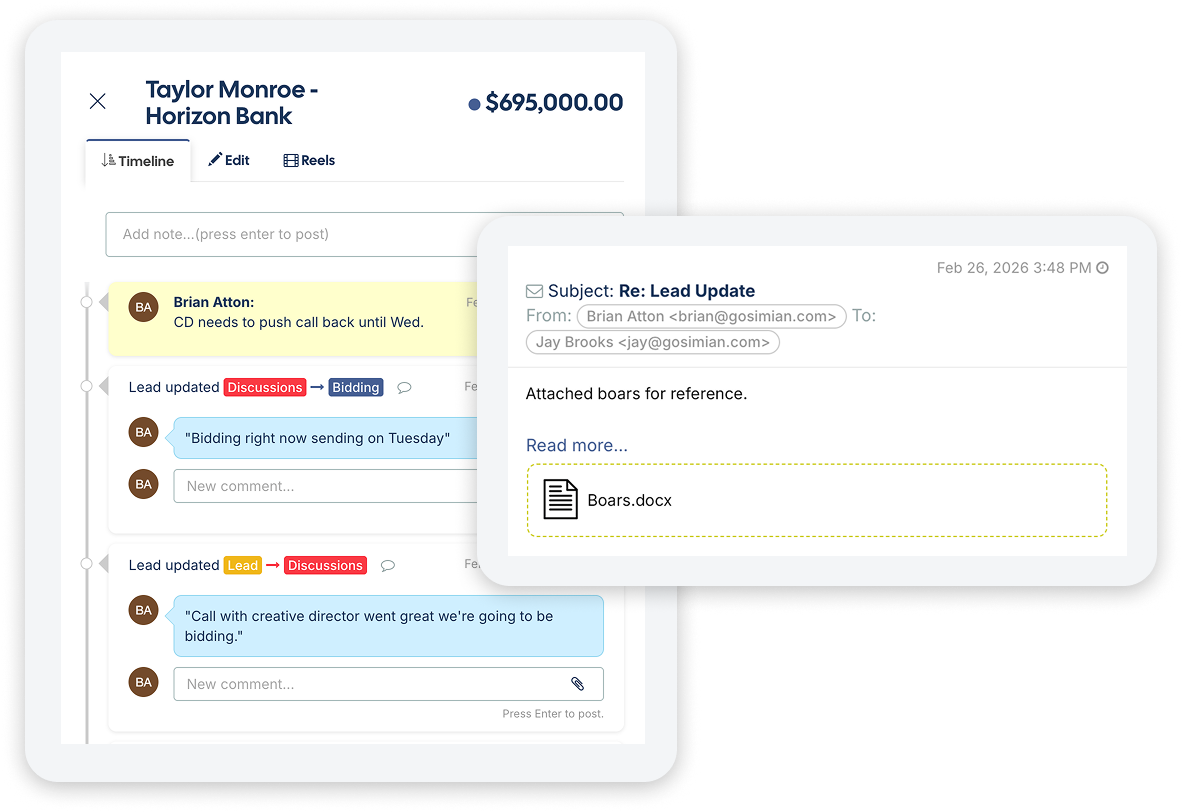 Each lead is assigned a unique Bcc key which can be easily copied to any email supplier's Cc/Bcc field. Once sent, that conversation will be automatically included in your lead timeline.